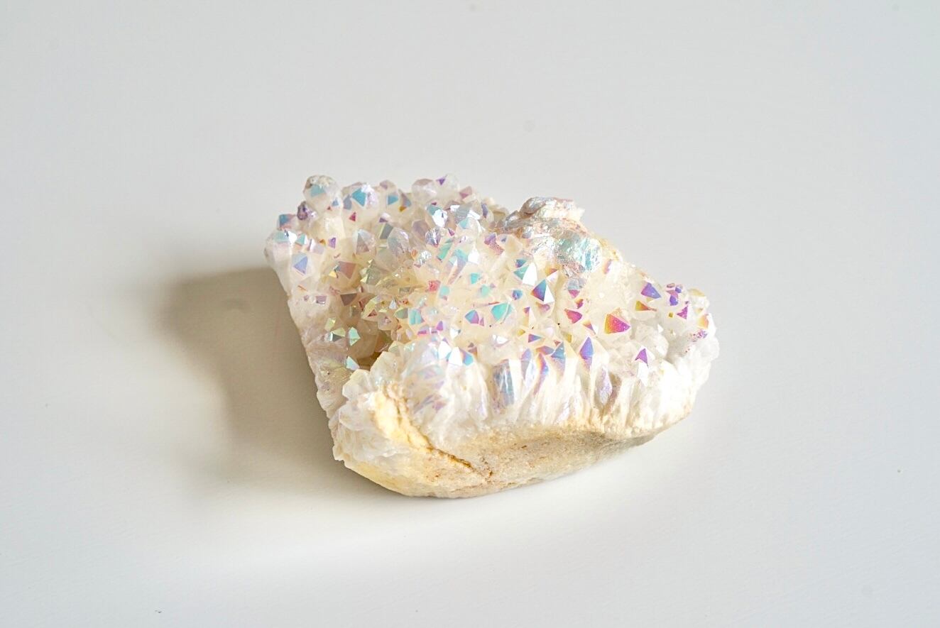 角度によってさまざまな色が見えるレインボーオーラクウォーツ。天然の水晶に真空状態でプラチナなどの金属を蒸着させた、新時代のクリスタルです。