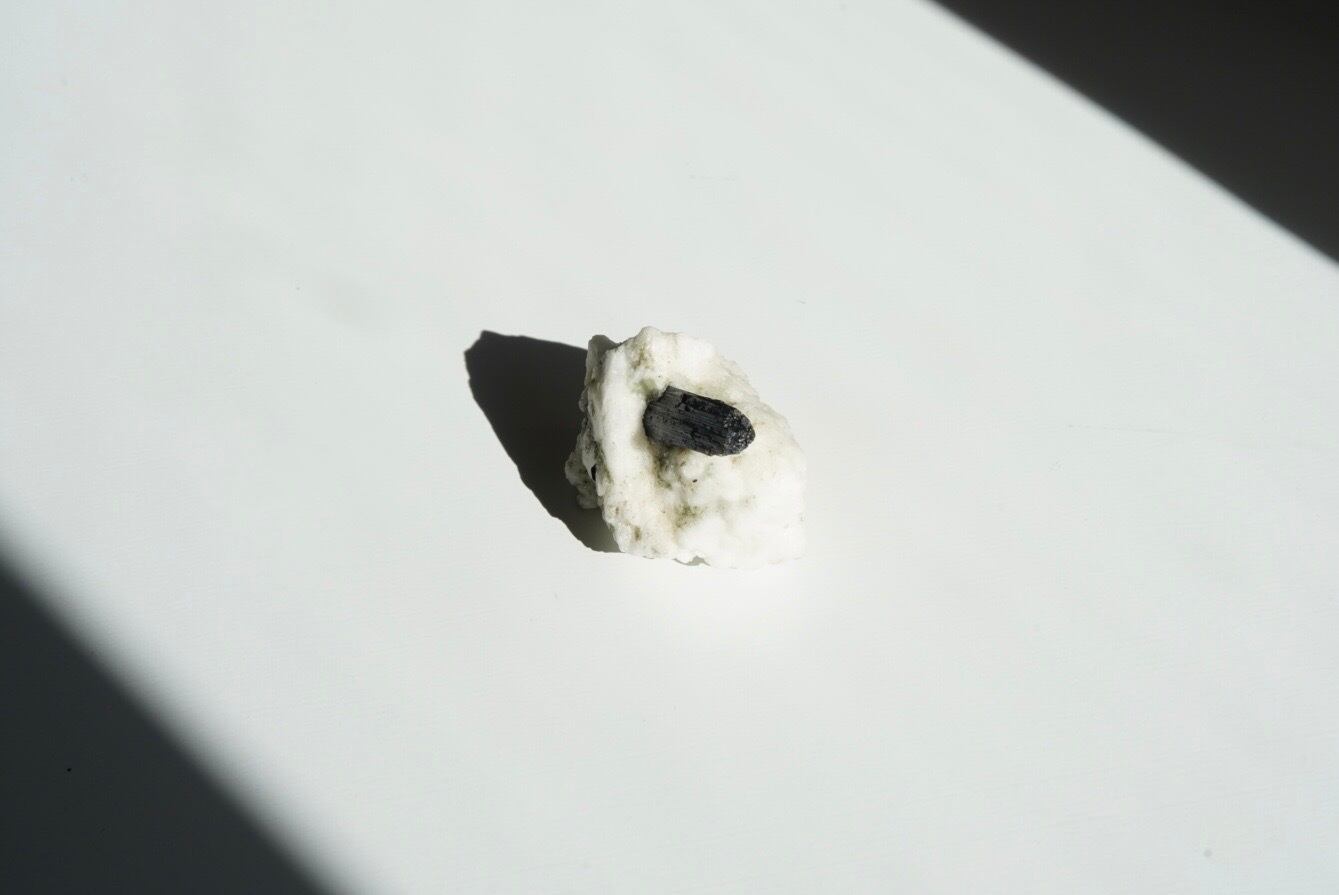 母岩のモスコバイトにくるまれる、ブラックトルマリン原石。